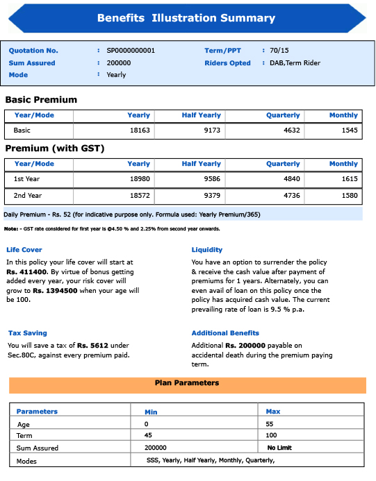 • Premium Payment Modes Yearly, Half-yearly, Quarterly, Monthly (ECS/Salary Deduction).